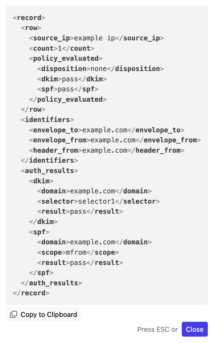 Aggregate Reports (RUA) Daily summaries from mail providers covering all email traffic they received claiming to be from your domain. For each sending IP address, they show how many messages were sent and whether they passed or failed SPF and DKIM checks. These are the most important reports for monitoring your domain.