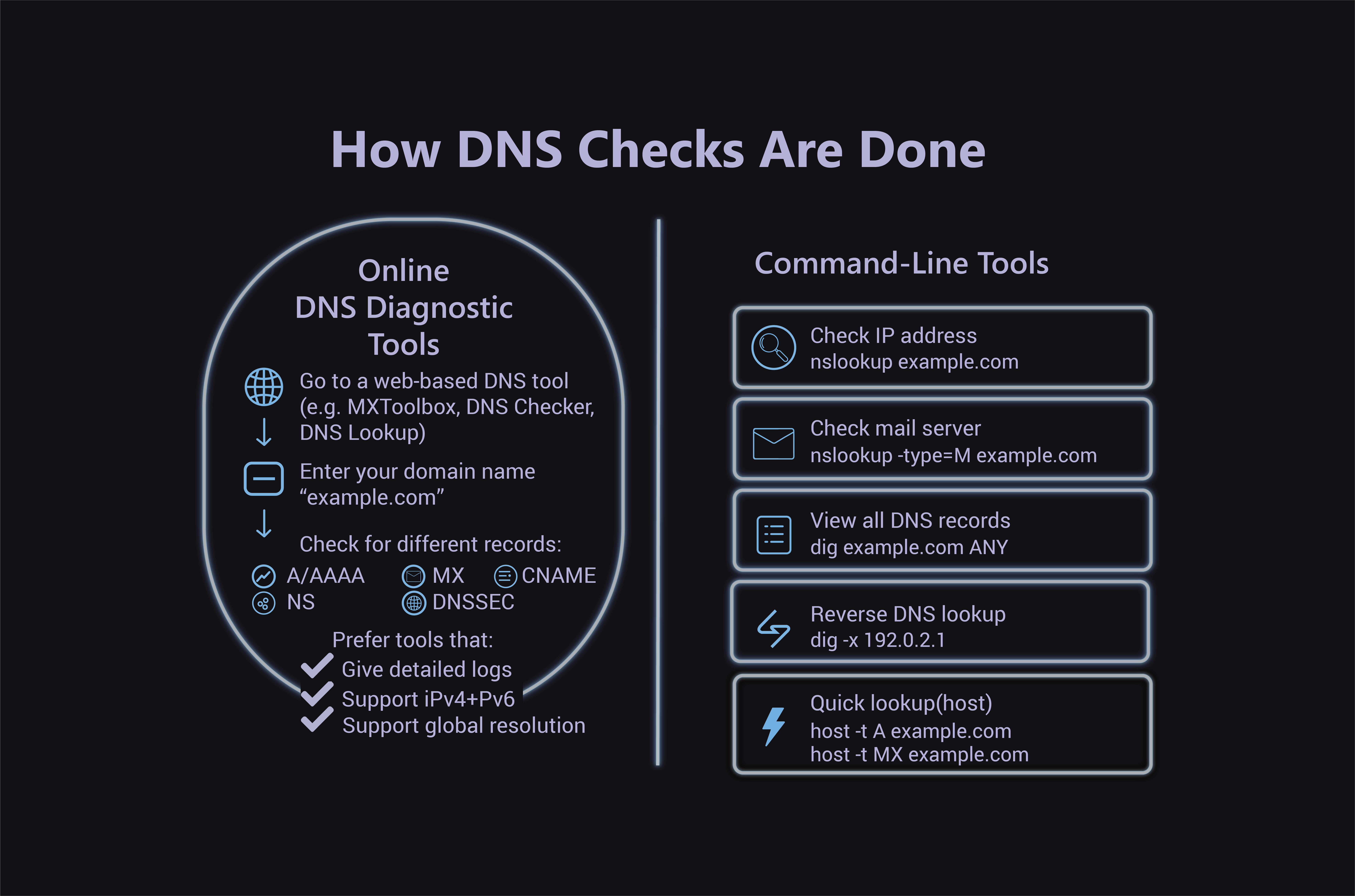Always use tools that provide you with detailed logs and support international DNS checking. Prefer tools that support both IPv4 and IPv6.